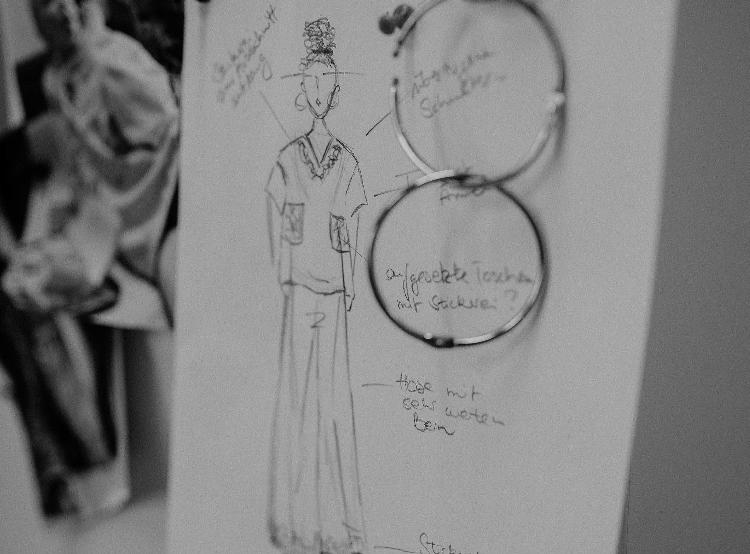 We start every new collection by researching the latest fashion trends and colors. However, not every trend is interesting or a good fit for us. So, we draw inspiration from current fashion trends and select the elements that best reflect our brand. A visit to the fabric fair in Munich also helps us with this. There, we gather further impressions and ideas. Once everything has been compiled, we create mood boards and color schemes, which are then assigned to different models and fabrics.
