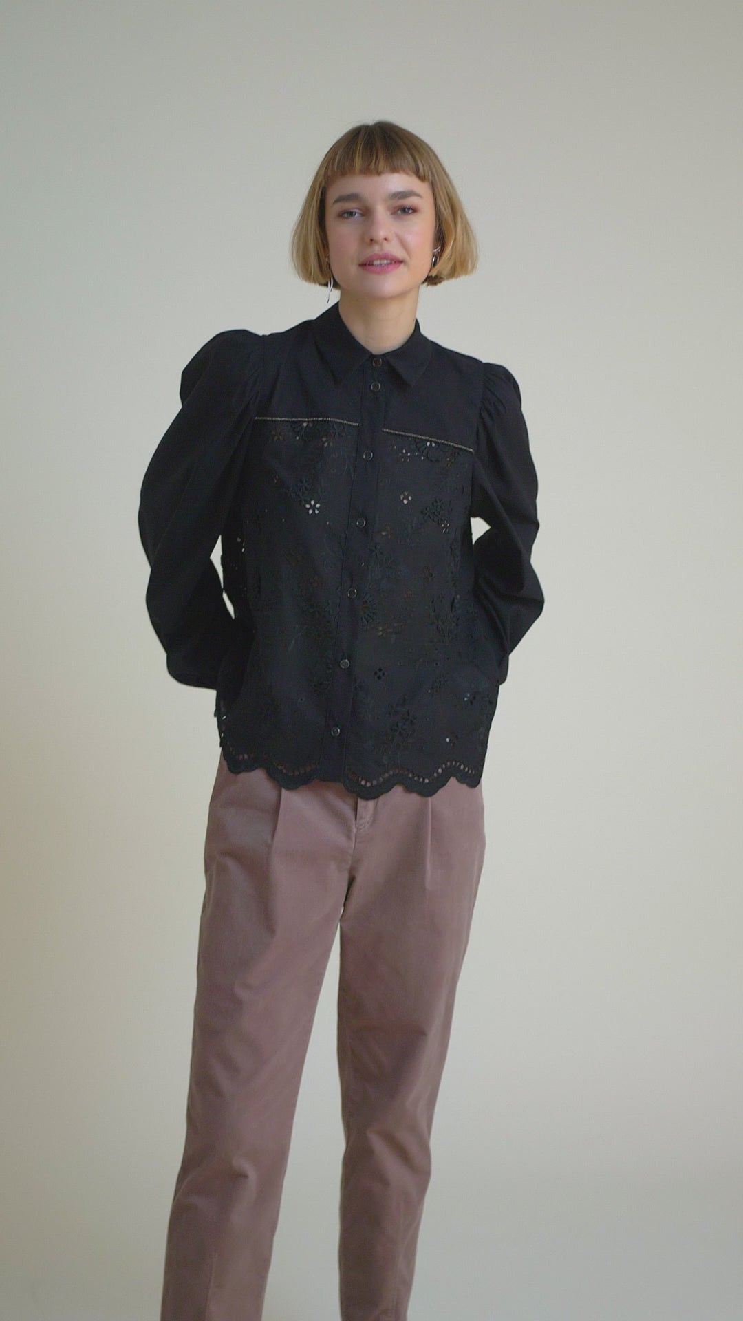 Short lace blouse with puff sleeves and glitter trim in a mixed material.