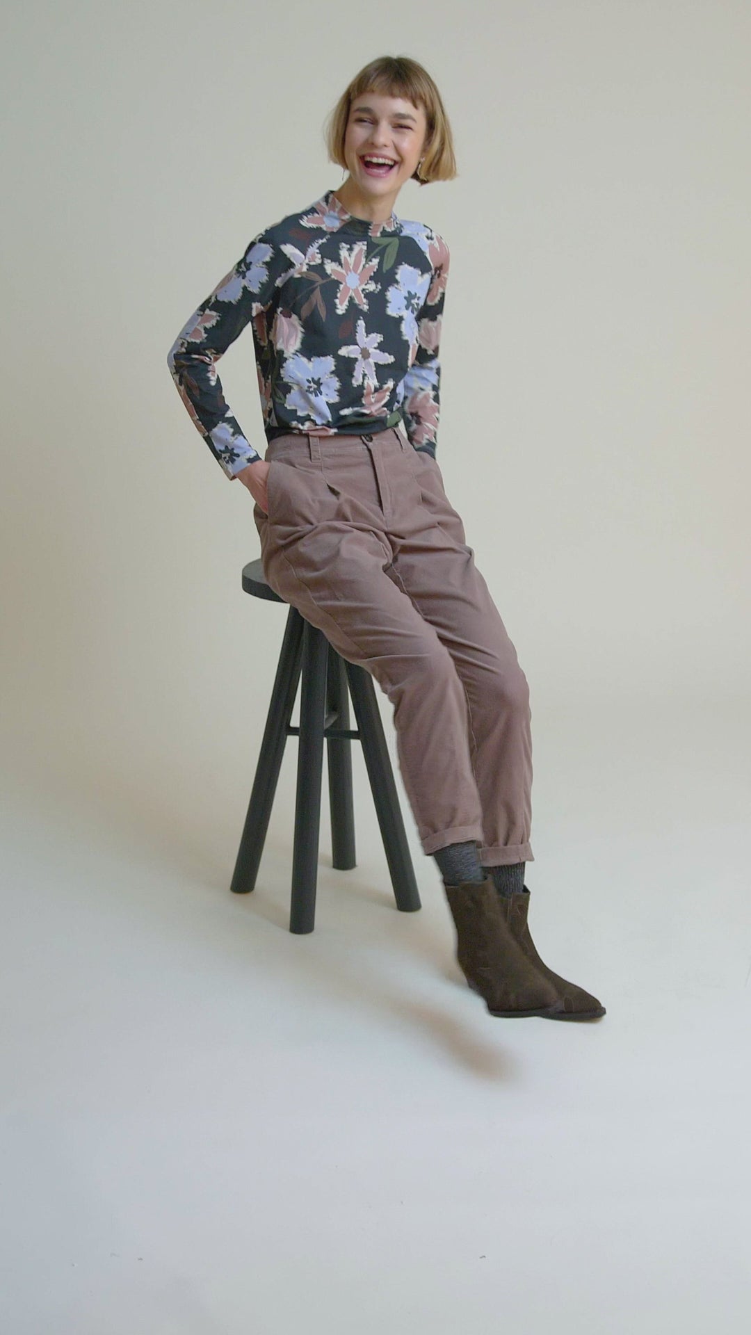 Longsleeve mit Stehkragen und besonderem Detail einer Raffung im Vorderteil mit Blumenprint.