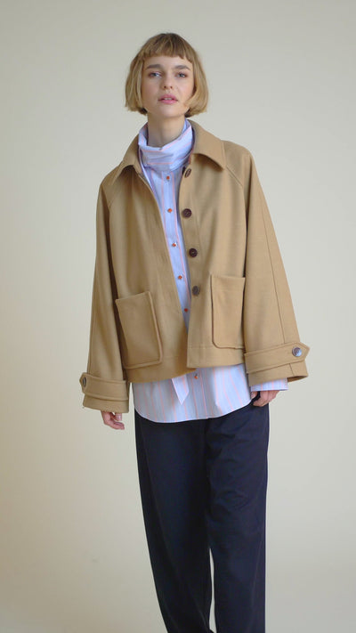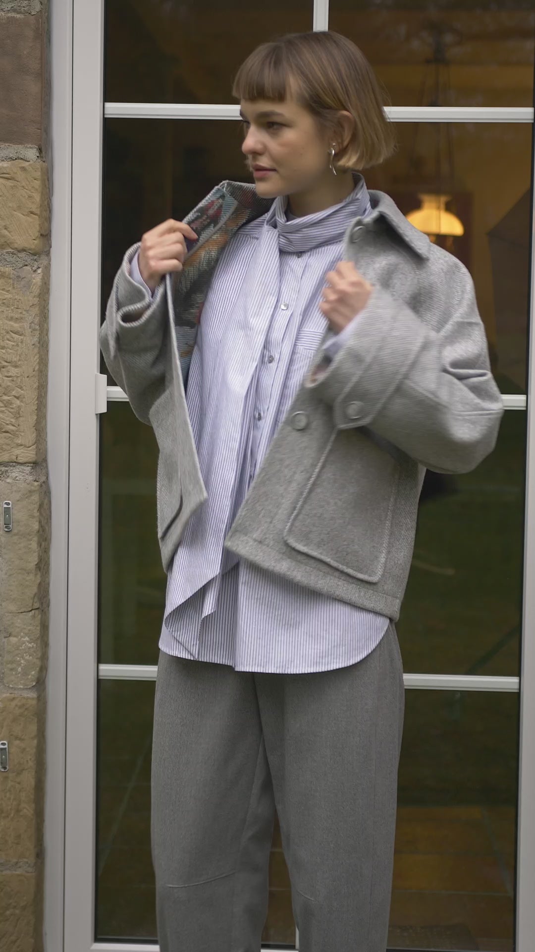 Kurze Wendejacke mit weiten, verstellbaren Raglanärmeln und großen aufgesetzten Taschen. Gewendet zeigen die Jacken die einzigartigen Prints der Saison.