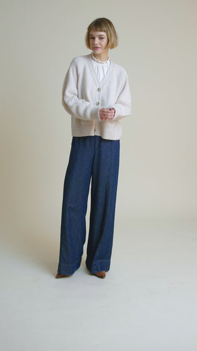 Leichter Wollcardigan mit feinem Blättermuster an den Ärmeln und kleinen Eingriffstaschen in zwei winterlichen Farben.
