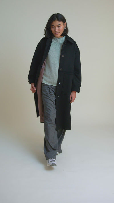 Wadenlanger Wollmantel mit besonderen Faltendetail an den Ärmeln und großen aufgesetzten Taschen.